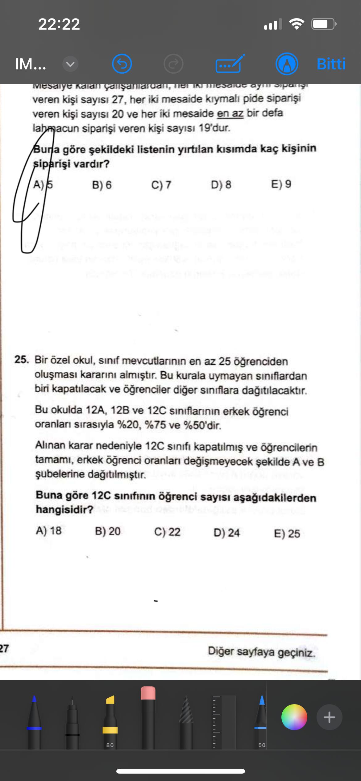 Seçeneklerdeki öğrenci sayılarından biri doğru olmalı. 12C’nin öğrenci sayısı en az 25 öğrenci olmalı (soru şartı).