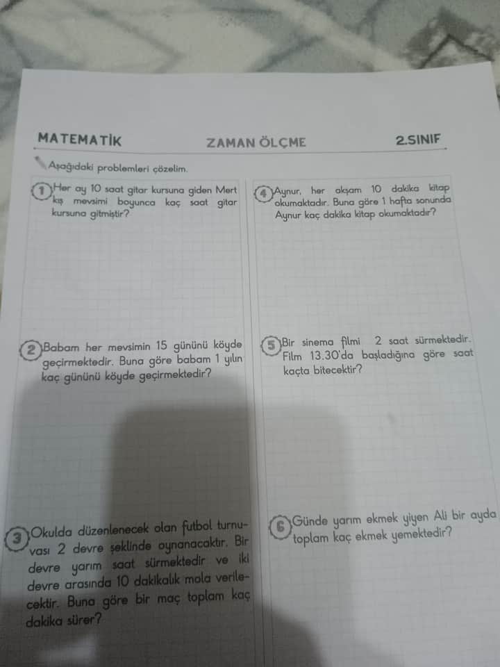 Aşağıdaki resimde 2. sınıf “Zaman Ölçme” konulu 6 problem yer alıyor. Her birini adım adım çözelim: