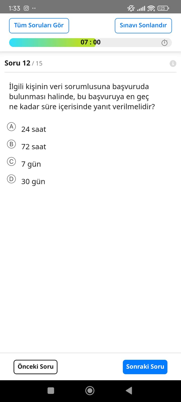 6698 sayılı Kişisel Verilerin Korunması Kanunu (KVKK)'ya göre, ilgili kişinin veri sorumlusuna yaptığı başvurulara en geç 30 gün içinde yanıt verilmesi gerekmektedir (Kaynak: KVKK). Yanıt, başvurunun sonucu ve varsa alınan/alinacak işlemler hakkında bilgi içermelidir.