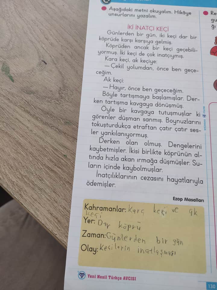 Bu metin, “İki İnatçı Keçi” adlı Ezop masalını anlatan bir hikaye örneğidir. Metin, temel hikâye unsurları ekseninde analiz edilebilir. İşte detaylarıyla açıklama: