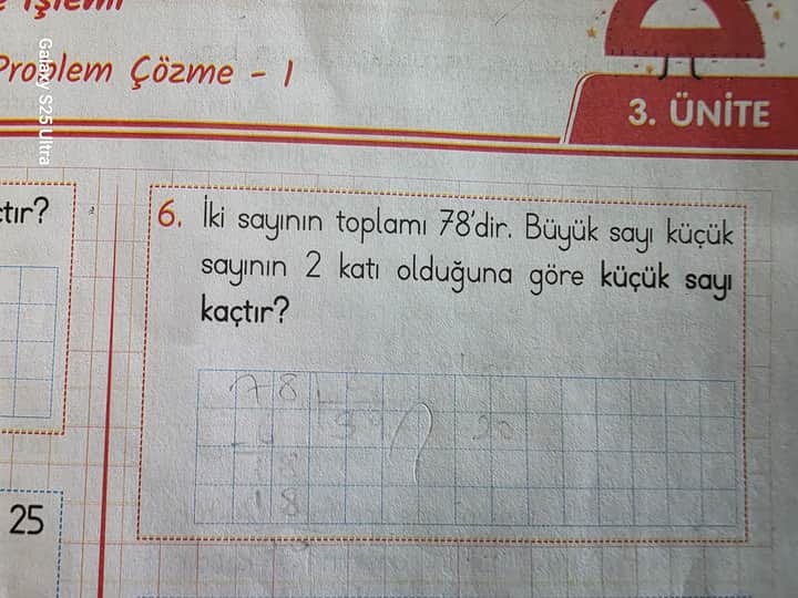 İki sayının toplamı 78’dir. Büyük sayı küçük sayının 2 katı olduğuna göre küçük sayı kaçtır?