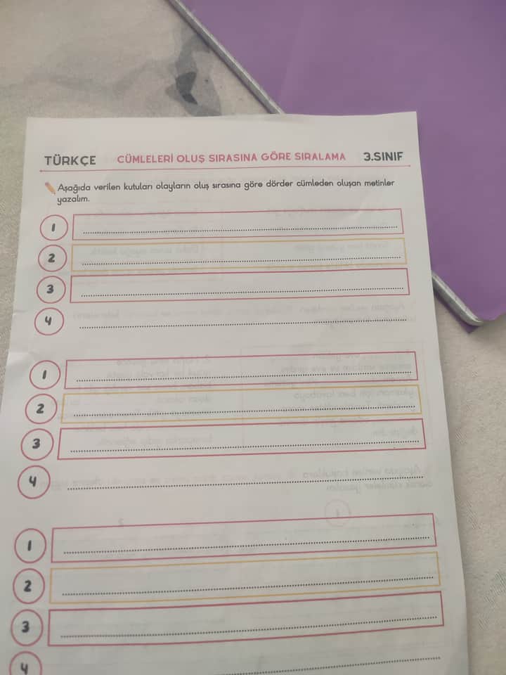 - sınıf etkinlikte, boşluklara olayların oluş sırasına göre dörder cümleden oluşan metinler yazılması istenmiştir. Etkinliği en iyi şekilde tamamlamak için, aşağıdaki adımları izleyerek her kutucuk için sıralı bir şekilde cümleler oluşturabilirsiniz.