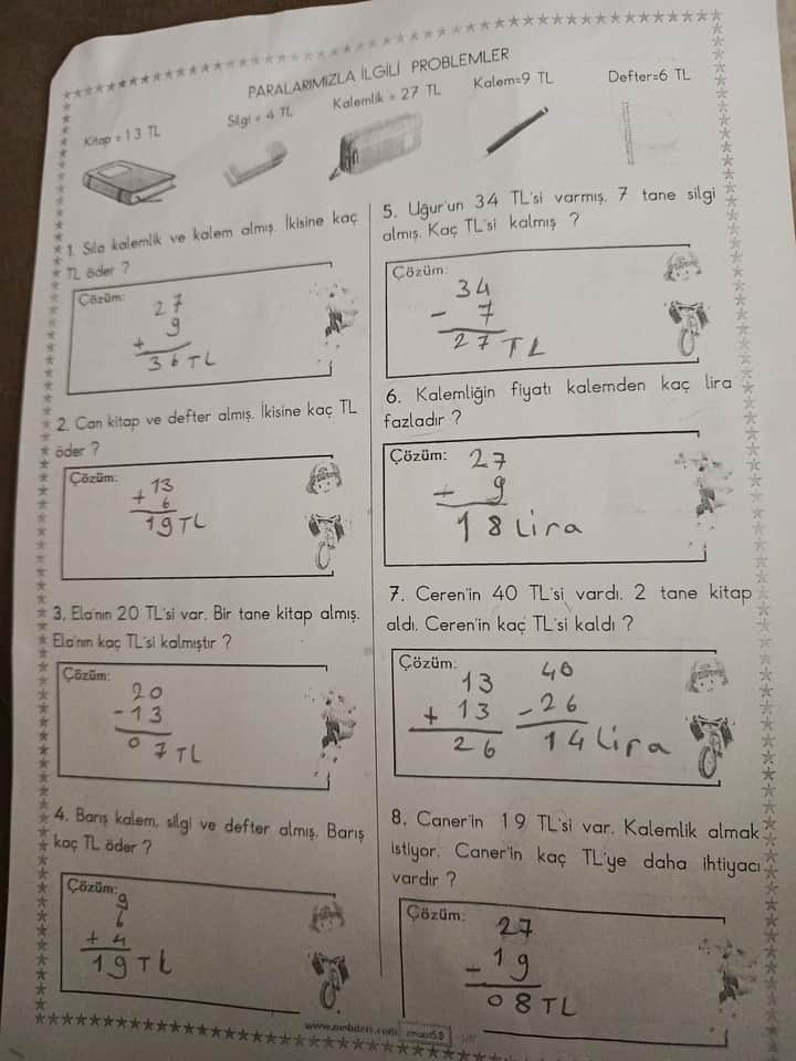 Diğer tüm sorular doğru çözülmüştür, ancak 8. soruda “08 TL” yerine “8 TL” demek daha doğrudur.