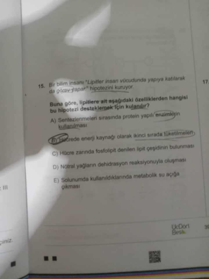 - C) Hücre zarında fosfolipit denilen lipit çeşidinin bulunması: Hücre zarının temel yapısal bileşenlerinden biri fosfolipitlerdir. Bu, lipitlerin yapıya katılarak görev yaptığını gösterir.