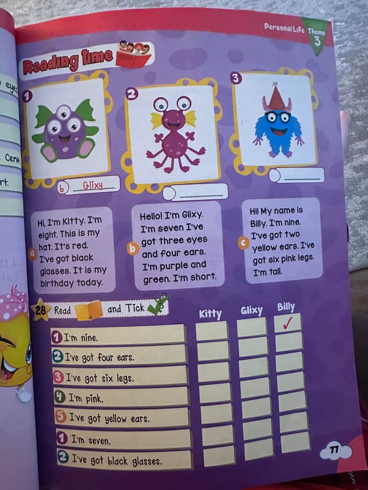 - Metni okuyun: “Hi, I’m Glix. I’m seven. I’ve got three eyes and four ears. My hair is short and green. I’m short.”