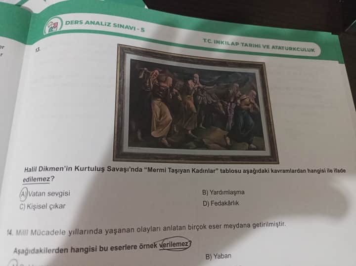 - C) Kişisel çıkar: Bu kavram tablo ile ifade edilemez. “Mermi Taşıyan Kadınlar” tablosunda vatan için fedakarlık yapan kadınların mücadeleleri anlatılıyor. Kişisel çıkar burada tamamen yanlış bir kavramdır ve Kurtuluş Savaşı’ndaki fedakarlıklarla bağlantısı kurulamaz.