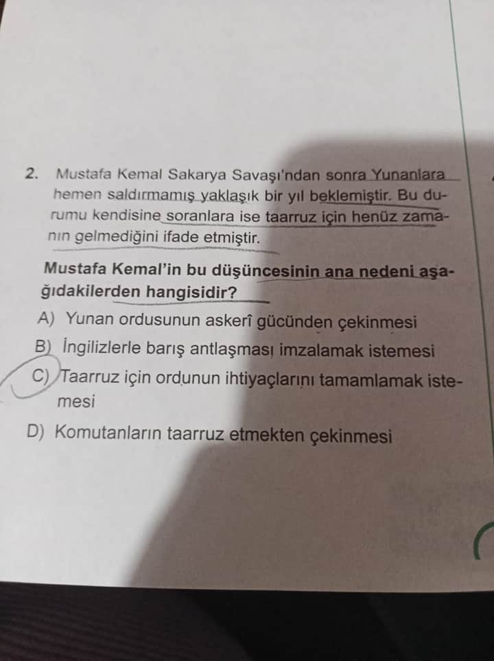 Cevap: C şıkkı, yani “Taarruz için ordunun ihtiyaçlarını tamamlamak istemesi” doğrudur.