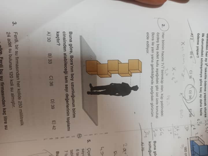 Buna göre Bora’nın boy uzunluğunun birim (küp kenar uzunluğu) cinsinden alabileceği tam sayı değerlerinin toplamı kaçtır?
