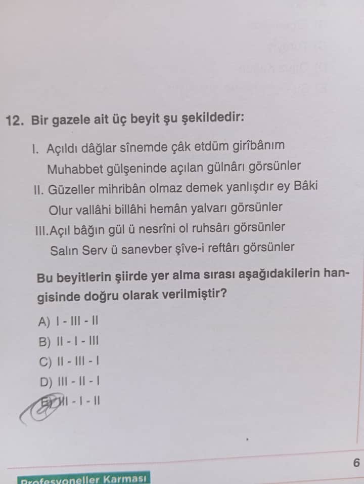 Gazel, klasik Türk edebiyatının önemli nazım şekillerinden biridir. Her gazelin belli bir bütünlüğü, beyitler arası anlam akışı ve özellikle şairin mahlasının geçtiği son beyit (makta) gibi karakteristik unsurları bulunur. Bu soruda üç ayrı beyit verilmiş ve bunların doğru sıralamasının ne olduğu sorulmaktadır.