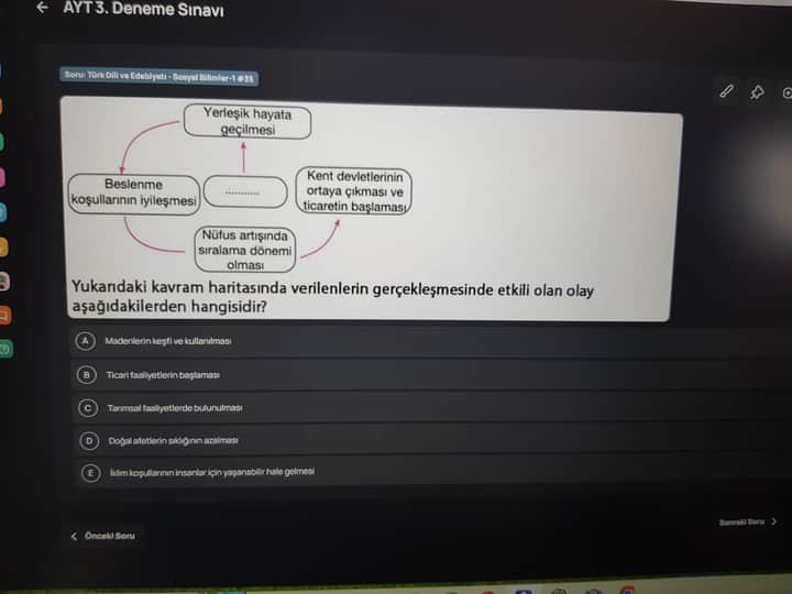 Bu kavram haritasında listelenen gelişmelerin (yerleşik hayata geçiş, beslenme koşullarının iyileşmesi, nüfus artışında sıçrama dönemi, kent devletlerinin ortaya çıkması ve ticaretin başlaması) temelinde yatan en önemli etken, tarımsal faaliyetlerde bulunulmasıdır. Yani doğru cevap, genellikle (C) şıkkı olarak belirtilen “Tarımsal faaliyetlerde bulunulması” seçeneğidir.