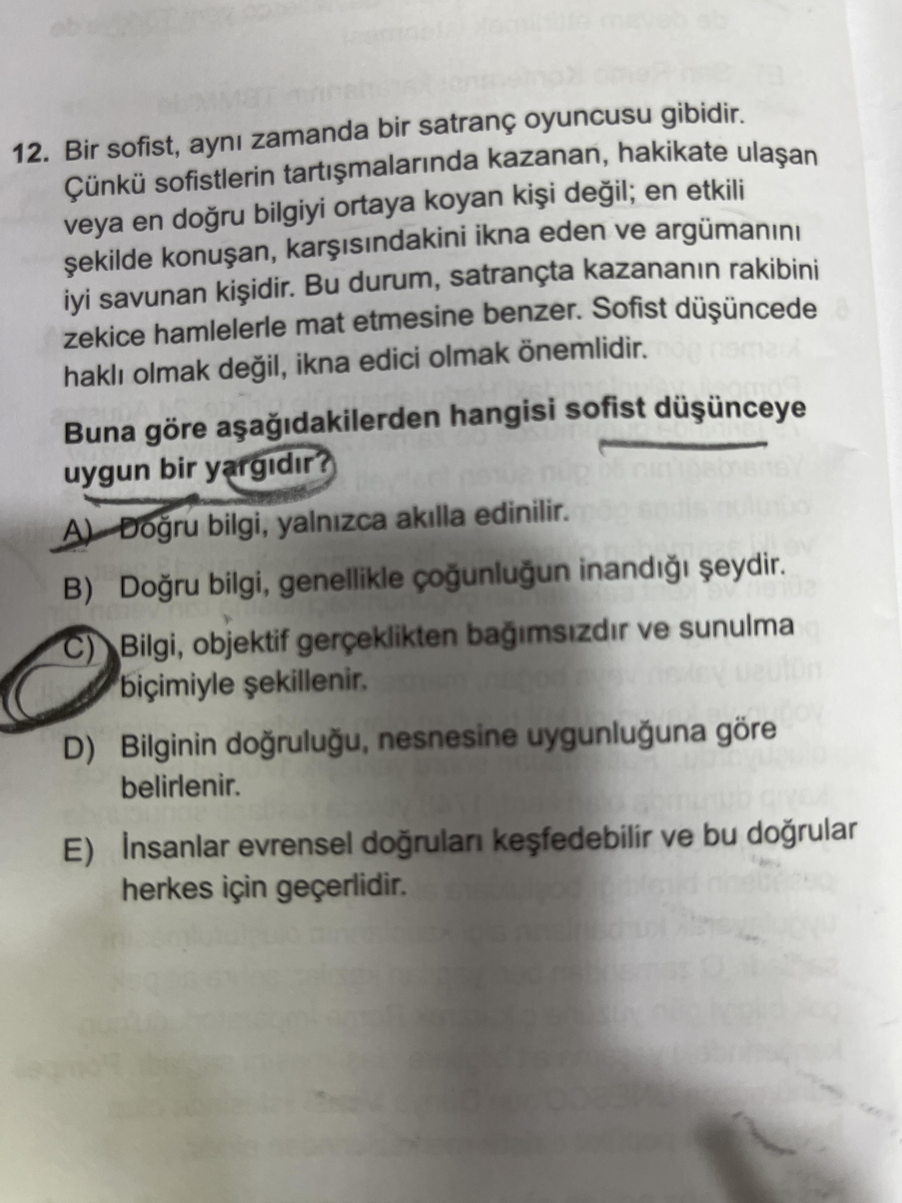- Bu yüzden C şıkkı, sofist geleneğin “bilginin göreli ve retorik temelli” anlayışını en doğru biçimde yansıtır.