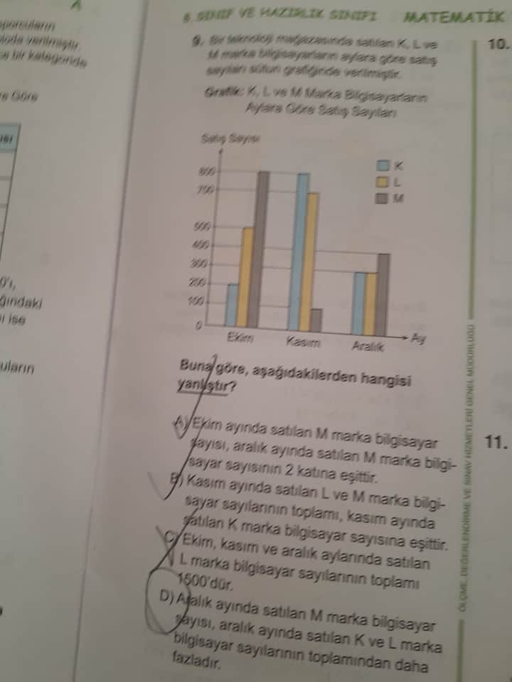 Grafikten okunan verilere göre, “Aralık ayında satılan M marka bilgisayar sayısı, aralık ayında satılan K ve L marka bilgisayar sayılarının toplamından daha fazladır.” ifadesi yanlıştır. Çünkü M markası 500 adet, K ve L toplamı ise 700 adettir. 500, 700’den büyük değildir. Yani yanıt D şıkkıdır.