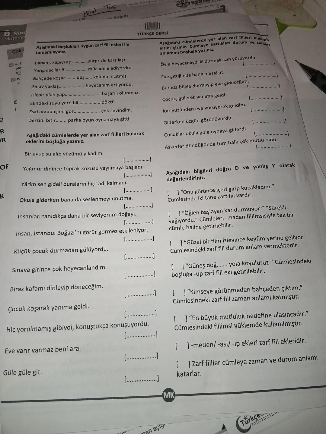 Türkçe LGS zarf fiil ekleriyle ilgili aşağıdaki bölümleri tamamlayınız.