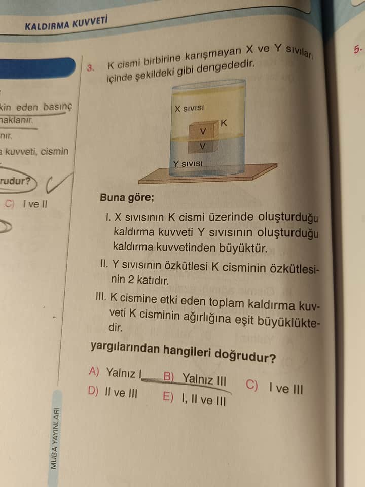 | Kaldırma kuvveti (X ve Y sıvıları içinde denge) | B) Yalnız III |
