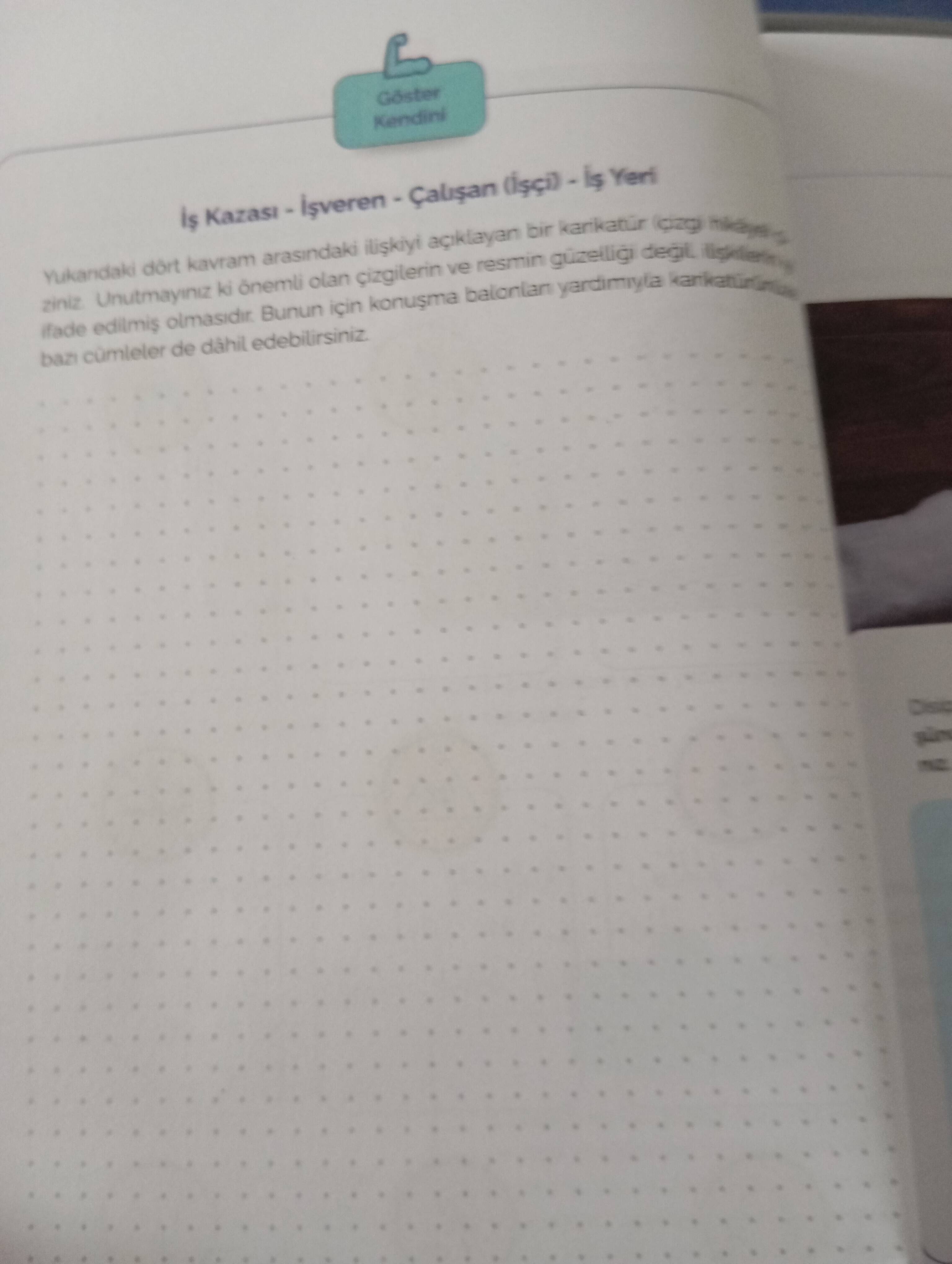 Görüntüde iş kazası, işveren, çalışan (işçi) ve iş yeri arasındaki ilişkiyi açıklayan bir karikatür çizmeniz isteniyor. Çizimlerin güzelliği değil, konunun düzgün ifade edilmesi önemli. Konuşma balonları kullanarak düşüncelerinizi resme ekleyebilirsiniz. Bu konularla ilgili bir karikatür çizmek için birkaç fikir şöyle olabilir:
