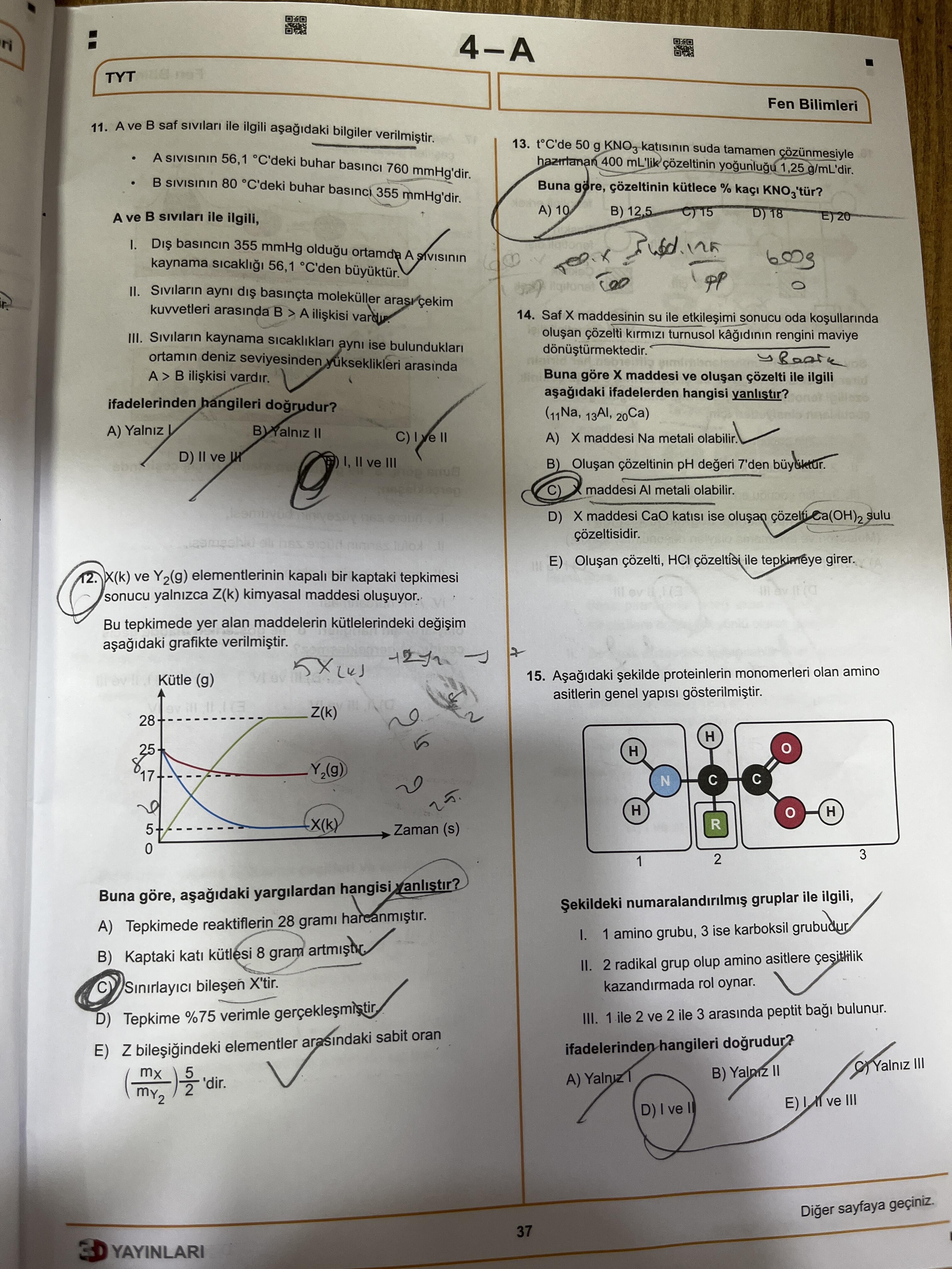 Fatma Doğan’ın forumda paylaştığı görsel 4-A isimli bir test kitabına ait TYT Fen Bilimleri sorularını içermektedir. Görselde birkaç soru yer almakta ve bazılarına el yazısıyla çözüm yapılmış. Ancak, bu soruların her birine verilen cevabı görsellerden net bir şekilde anlayamıyorum.