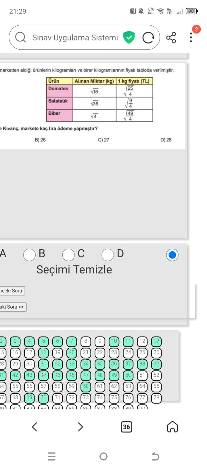- Miktarlar karekök ile verilmiş: domates için \sqrt{16}, salatalık için \sqrt{36}, biber için \sqrt{4}.