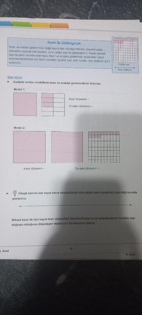 Sunrf veaik gosterimier doğal sayilardan aldukça farkldir, Cremzdaki sayna jslemi ie eldo aogu sast le gösterebliriz Fakat knsidor aamardrabilmek için farki tnoeelece arastndaki ikşkiy alan nmadel, say dogrusu gb) kultanınz SRO SlzDE Aşağıda verilen modellerin kesir ve ondalhk gösteirnlerini bulunuz. Model 1 Model [e Gösteriyorum Model 2 Kesir Göstenm Kesir Gcsterim - Ordalk Gesteina Crndalık Goslerim- Sayı co 25 bileşik kesrini tam sayılı kesre dönüştürorek elde ettigin kesri asağidaki sayı doğrusunda gösteriniz. Bilesik kesir ile tam sayılı kesir arasındaki ifigkilendirmeyi on iyi anlanlandira modelin sav doğrusu olduğunu dişünuyor musunur? Gerekcesini yazn Sunst