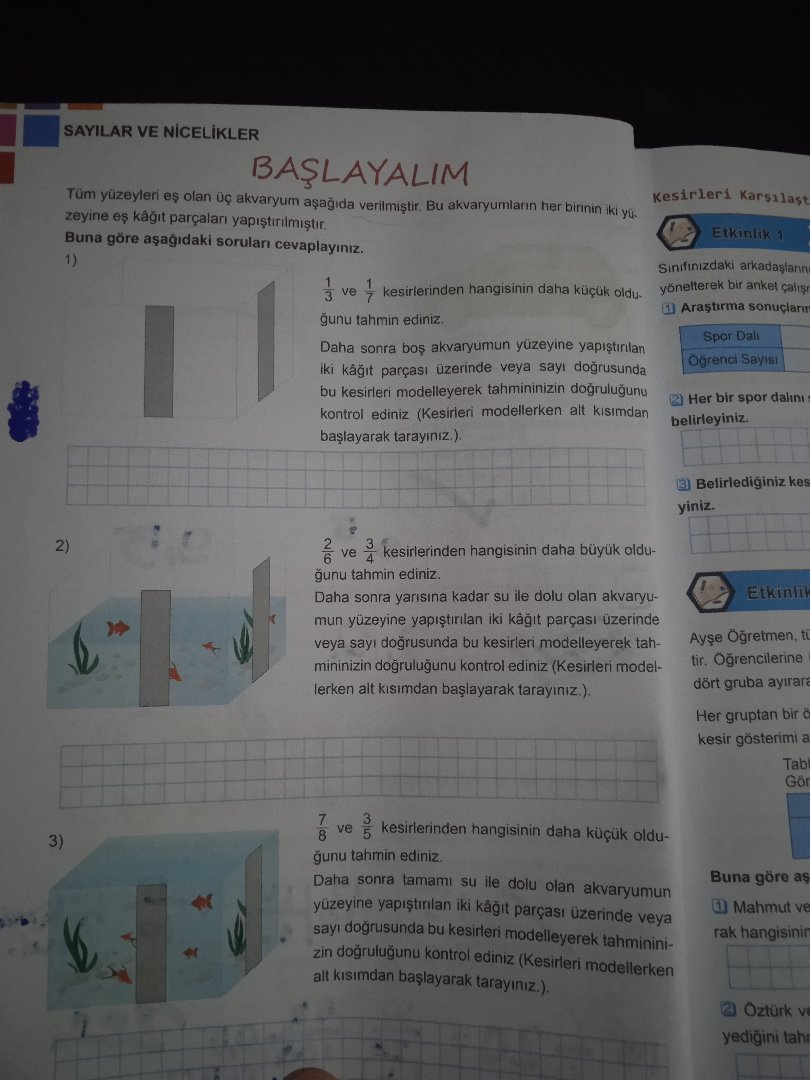 - 1/7, 1/3’ten küçüktür; 2) 2/6 (yani 1/3) ile 3/4 karşılaştırıldığında 3/4 daha büyüktür; 3) 3/5 ile 7/8 karşılaştırıldığında 7/8 daha büyüktür. Bu tahminleri akvaryum yüzeyini tabandan tarayarak veya sayı doğrusu ile doğrulayabilirsiniz.
