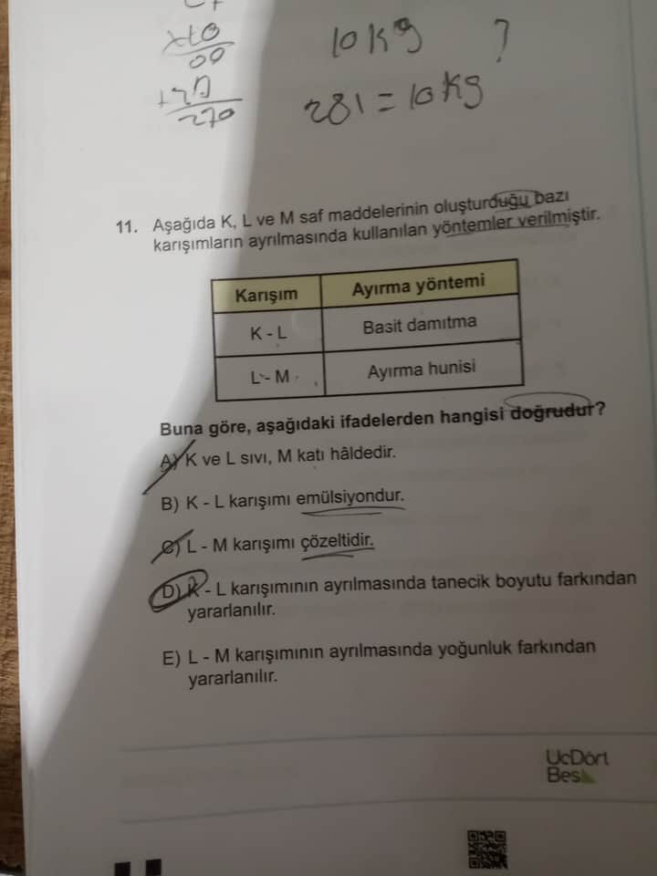 Kimya soru: K, L ve M saf maddelerinin oluşturduğu karışımların ayrılmasında kullanılan yöntemler ve doğru ifade hangisidir?