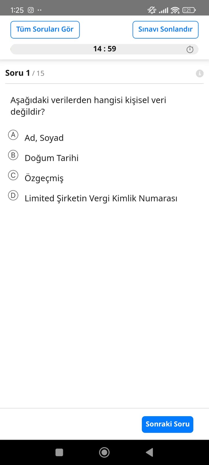 Doğru cevap: D. Limited şirketin vergi kimlik numarası, tüzel kişiyi tanımlar; kişisel veri, kimliği belirli veya belirlenebilir gerçek kişiye ait bilgidir (ör. ad, soyad, doğum tarihi, özgeçmiş). İstisnai durumlarda bu numara gerçek bir kişiyle doğrudan ilişkilendiriliyorsa farklı değerlendirme gerekebilir.