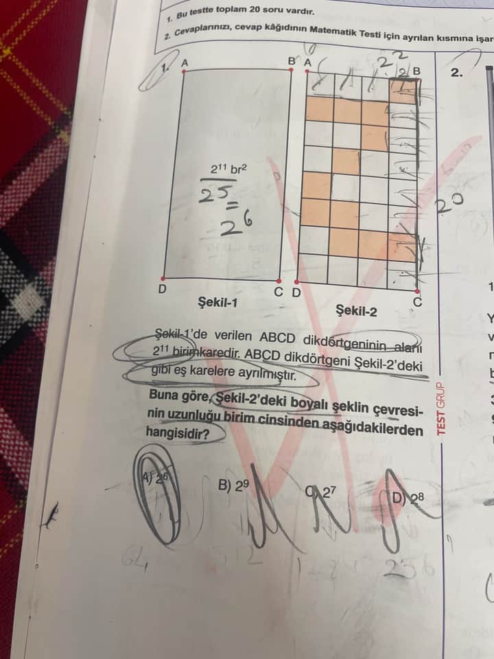 Dolayısıyla, Şekil-2’deki boyalı şeklin çevresi genellikle 2^7 = 128 birim olarak bulunur. Sorudaki çoktan seçmeli şıklarda (A) 2^6, (B) 2^9, (C) 2^7, (D) 2^8 gibi seçenekler geçiyorsa doğru cevap çoğunlukla 2^7 (128) olmaktadır.