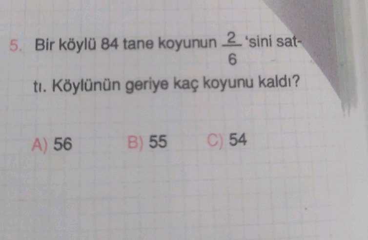 - Bir köylü 84 tane koyunun2’sini sat- ti. Köylünün geriye kaç koyunu kaldi? A) 56 6 B) 55 C) 54