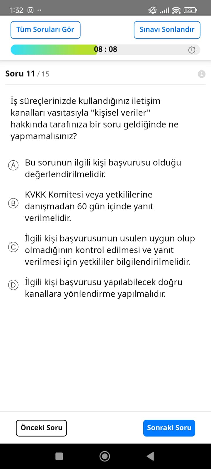 - Doğru cevap B şıkkıdır: Bu seçenek, kişisel veri talebine yetkisizce ve yanlış süre (60 gün) belirterek yanıt vermeyi önerdiği için hatalıdır; KVKK’ya göre başvurular 30 gün içinde işlenmeli ve komiteye danışılmalıdır.