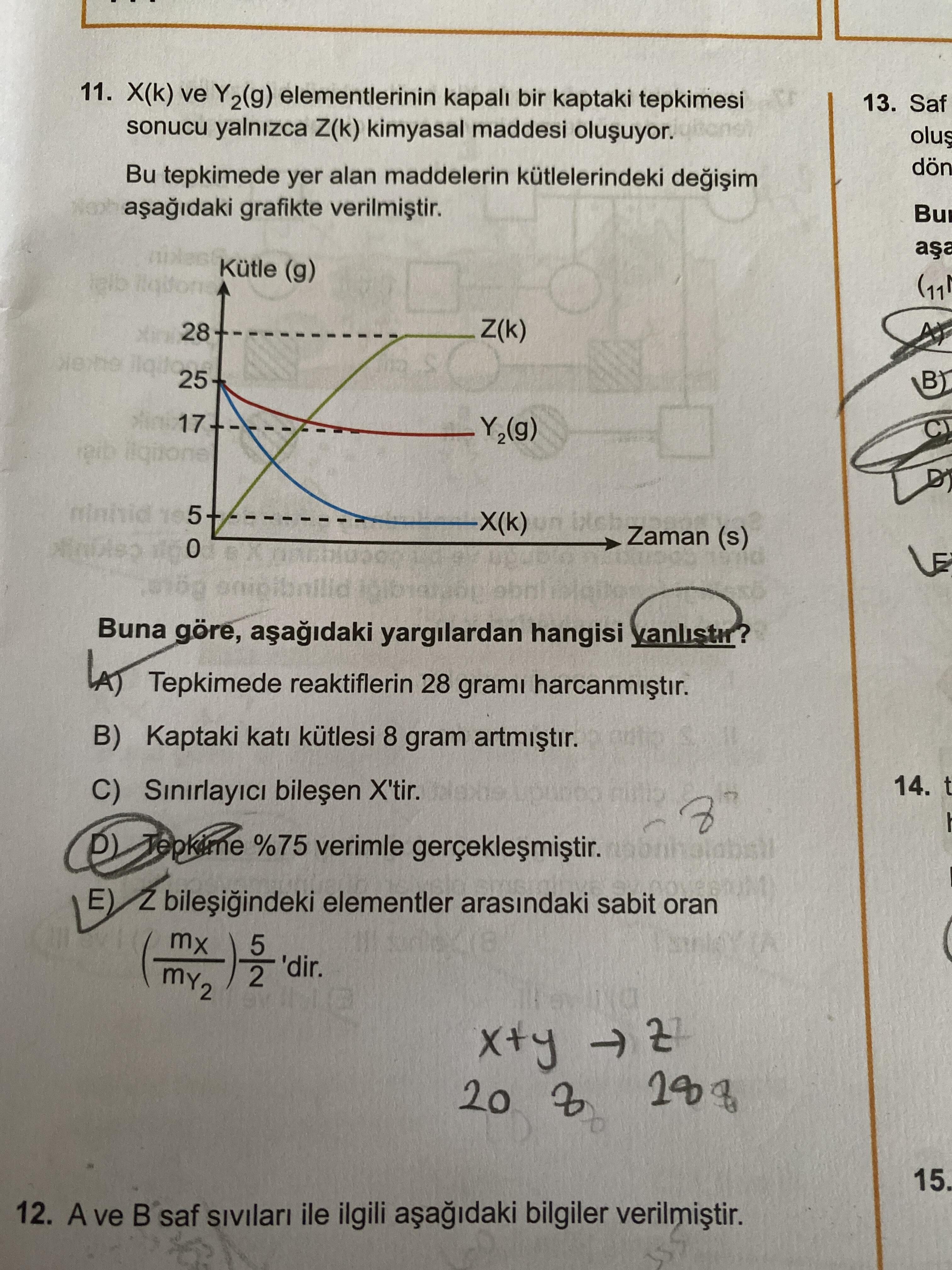 - Grafikte X ve Y₂’nin başlangıç ve bitiş kütlelerine bakılarak, tepkimede toplam 28 gram reaktanın tükendiği söylenmişse bu, büyük olasılıkla X’in ve Y₂’nin kaybettiği kütlelerin toplamına işaret eder.