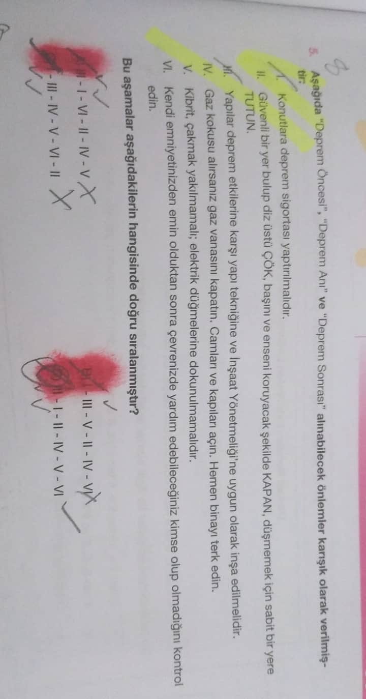 Bu soruda, “Deprem Öncesi,” “Deprem Anı” ve “Deprem Sonrası” alınabilecek önlemler sırasıyla verilmiştir. Doğru sıralama ise şu şekilde olmalıdır: