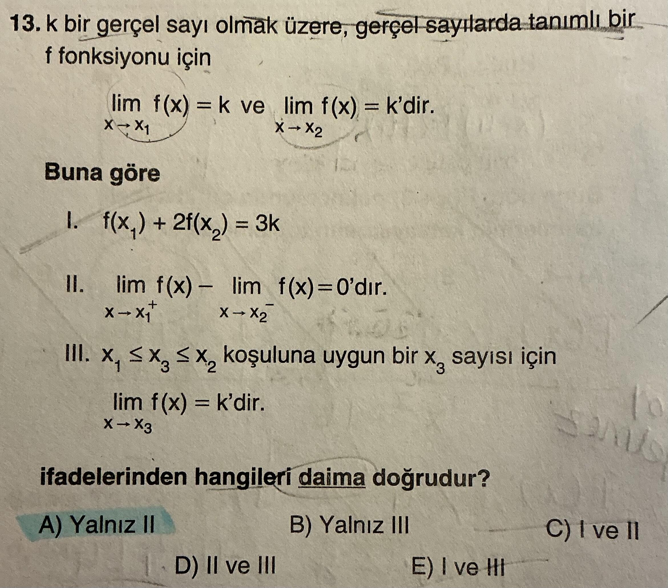 Ancak soruda limitlerin k ve k' olduğu belirtilmiş, ve seçeneklerde sadece II veya III doğru olabilir denmiş.