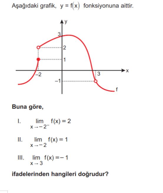 Aşağıdaki grafik, y = f(x) fonksiyonuna aittir. Buna göre, verilen limit ifadelerinden hangileri doğrudur?