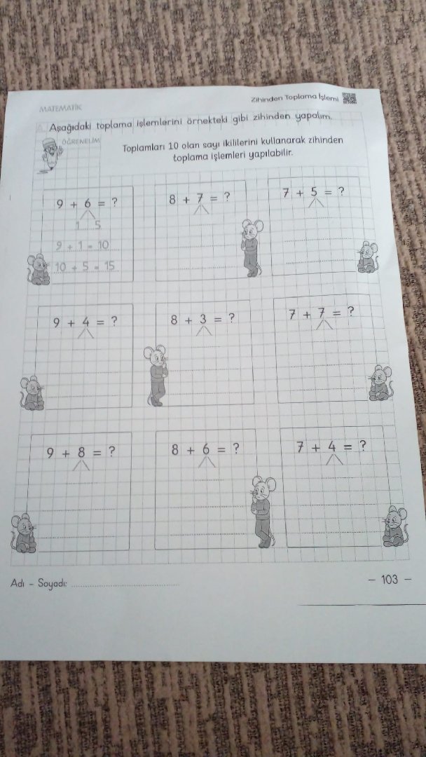 MAIEMAIK Aşağıdoki toplama lelernlerini örhekteki qibl zibinden yapolum oüRCNELIA 9+6 = 9+1-.1O 105 15 9+ 4 =? 9+8 =? Ad - Soyod: Toplamları 10 olan saui ikililerini kullanarak zihinden toplama işlemleri yapılabilir. 8+ 7 =? Zhinden Toplorma lşlerm 8 8+3 = ? 8+6 = ? 7+5 -? +7= ? 7+4 =? 103
