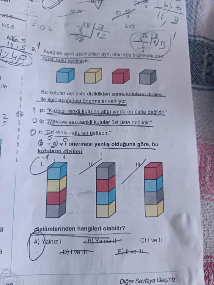 | I | Mavi - Sarı - Kırmızı - Gri | Evet (Gri en üst) | Evet (Kırmızı 3. sırada) | Evet (Mavi-Sarı bitişik) | Gri üstte → r yanlış olmaz. Dolayısıyla elenir. |