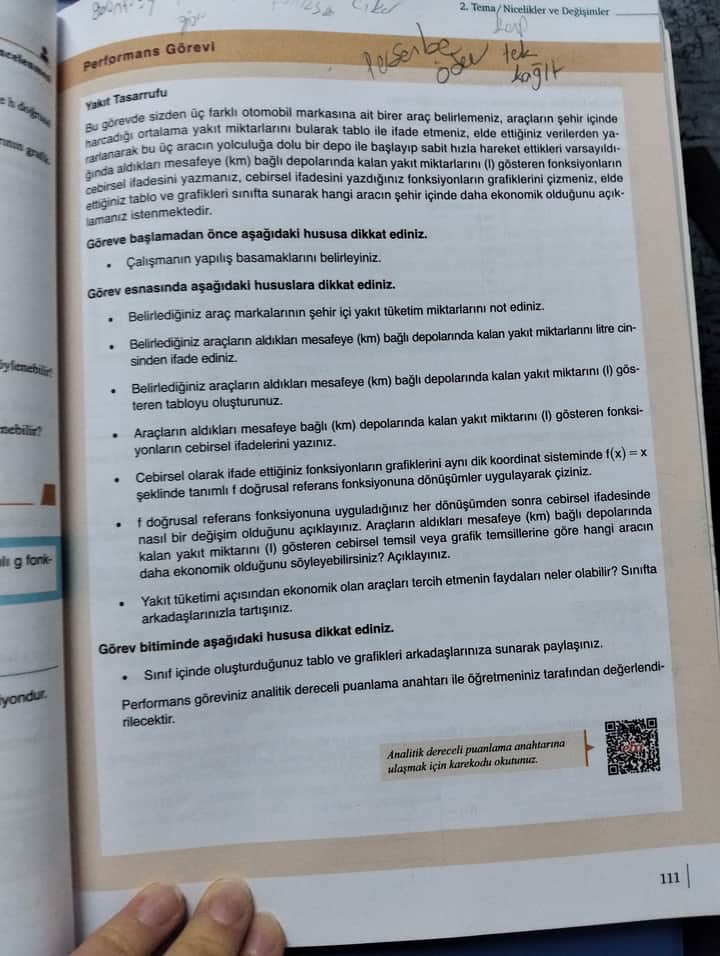 İstediğin gibi birbirinden farklı 3 ayrı çözüm (A, B, C) hazırladım. Her çözümde: araç markası, depo hacmi, şehir içi ort. tüketim (L/100 km) belirtilmiş, bunu litre/km’ye çevirip kalan yakıtı mesafeye bağlı fonksiyon olarak yazdım, örnek tablo verdim ve hangi aracın daha ekonomik olduğunu belirttim. Kendi kitabındaki yönergelere göre bu cevapları doğrudan kullanabilir veya küçük rakam değişiklikleriyle farklılaştırabilirsin.