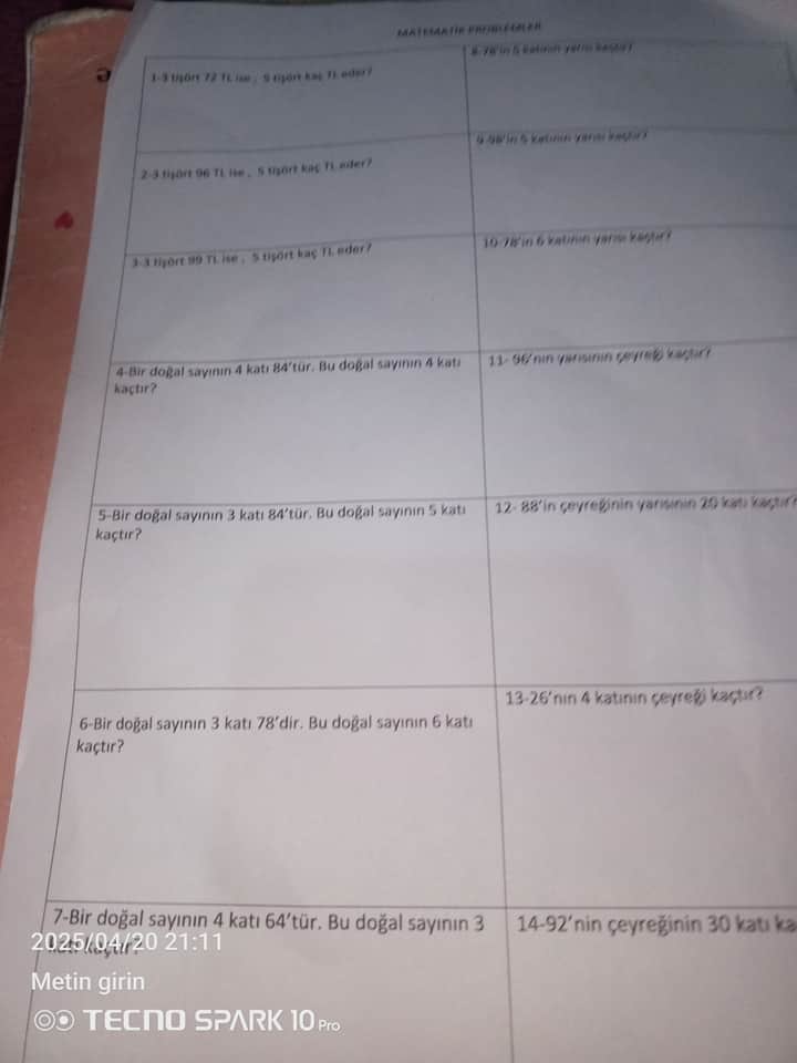 4) Bir doğal sayının 4 katı 84’tür. Bu sayı kaçtır (veya 5 katı vs.)?