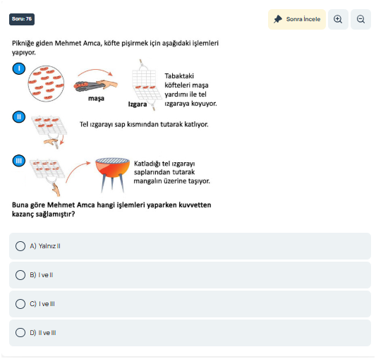 Cevap: Bu soruya ait en yaygın fiziksel analiz doğrultusunda, Mehmet Amca’nın birinci işlemde (maşa kullanma) kuvvetten kazanç sağlamadığı, ancak ikinci ve üçüncü işlemlerde (tel ızgarayı kaldırma ve katlayıp taşıma) kuvvetten kazanç sağladığı kabul edilir. Dolayısıyla doğru seçenek “C) II ve III” şeklindedir.