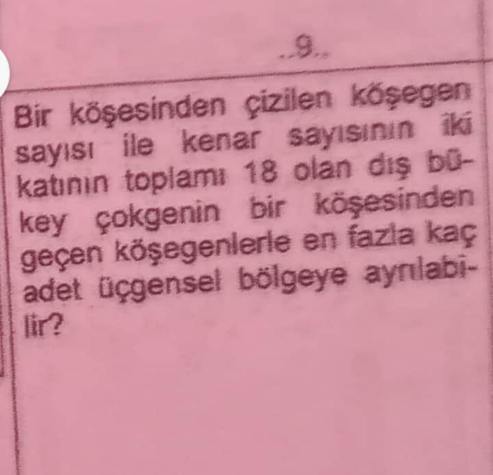 “Bir köşesinden çizilen köşegen sayısı ile kenar sayısının iki katının toplamı 18 olan dış bükey çokgen…”