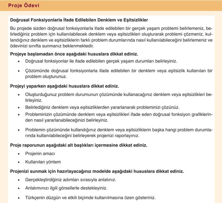 Bu projede, doğrusal fonksiyonlar ile ifade edilebilen bir gerçek yaşam problemi seçilip (örnek olarak: su faturası hesaplaması) bu probleme uygun denklem ve/veya eşitsizlikler yazmanız, denklem/denklem grubunu çözmeniz ve oluşturulan modele dair gerçek yaşamda başka nerelerde kullanılabileceğini analiz etmeniz bekleniyor.