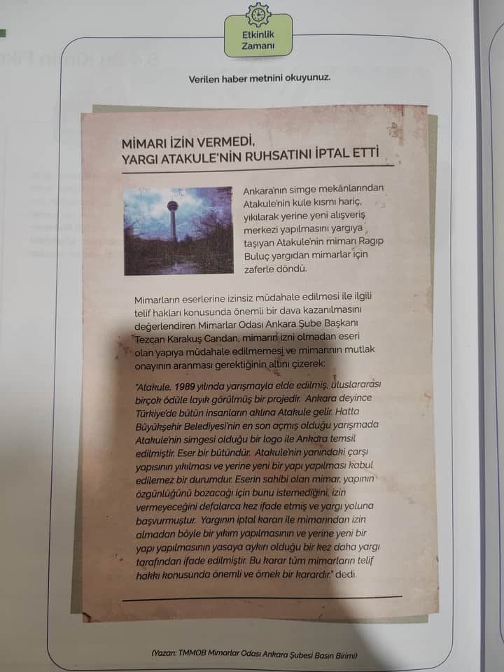 Metinde mimarların, eserlerine müdahale edilmesi durumunda yasal sürece başvurma haklarının olduğu ve bunun sonucunda bir başarı elde ettikleri anlatılmaktadır. Mimarların uğraşmış oldukları spesifik alan, tasarım ve sanat odaklı olduğundan dolayı buradan başka meslek gruplarında da benzer durumlarla karşılaşılabileceğine dair çıkarımlarda bulunabiliriz.