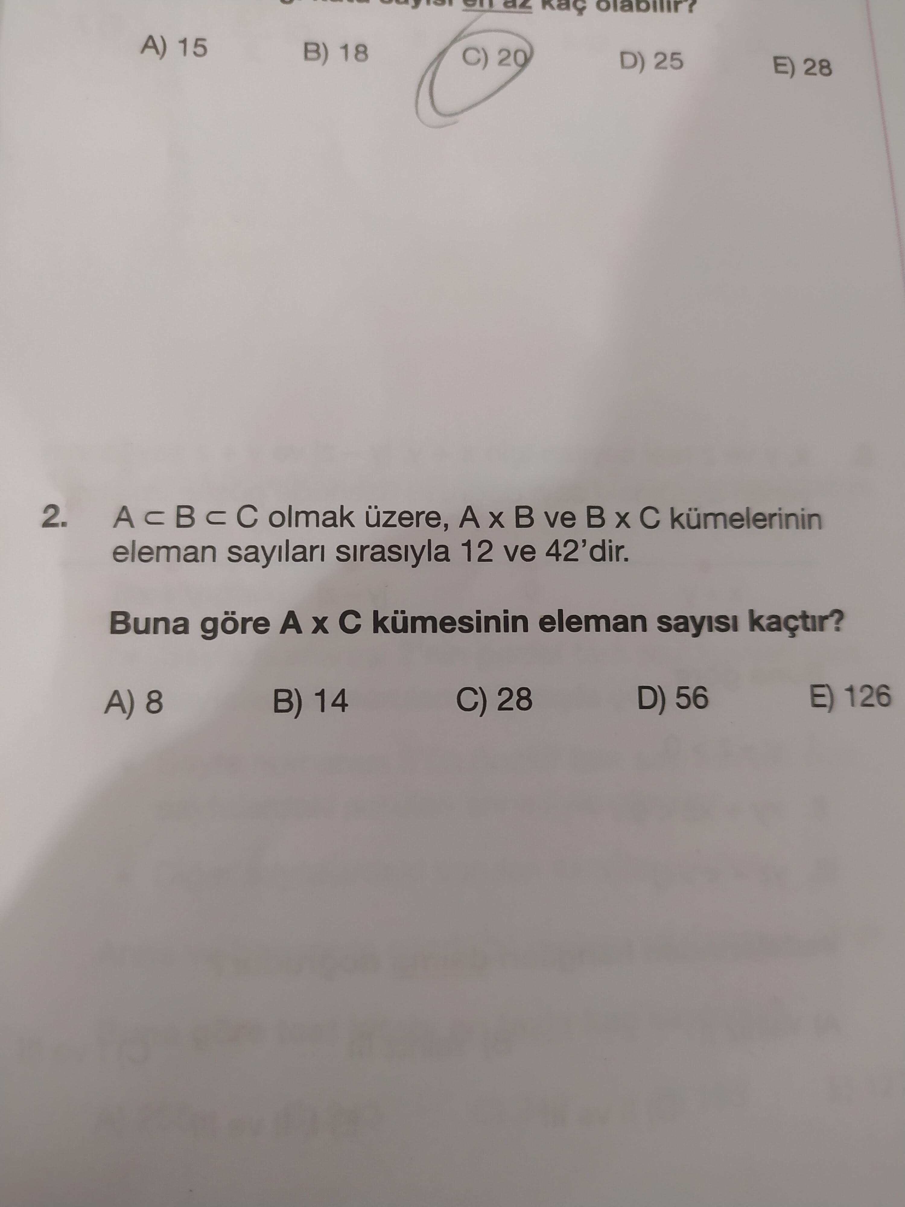 2. A ⊂ B ⊂ C olmak üzere, A × B ve B × C kümelerinin eleman sayıları sırasıyla 12 ve 42’dir. Buna göre A × C kümesinin eleman sayısı kaçtır?