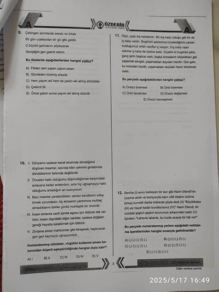 Bu sorularda istenen çözümleri adım adım ele alalım. Elimizdeki fotoğrafta 9, 10, 11 ve 12. sorular görünmektedir. Her biri Türkçe’de hem sözcük yapısı/ekler hem de yazım-noktalama ve ses olayları gibi konuları kapsıyor. Aşağıda, ilgili soruların çözüm mantığını ve varsa doğru cevapları bulmak için izlenmesi gereken yöntemleri ayrıntılı biçimde inceleyeceğiz.