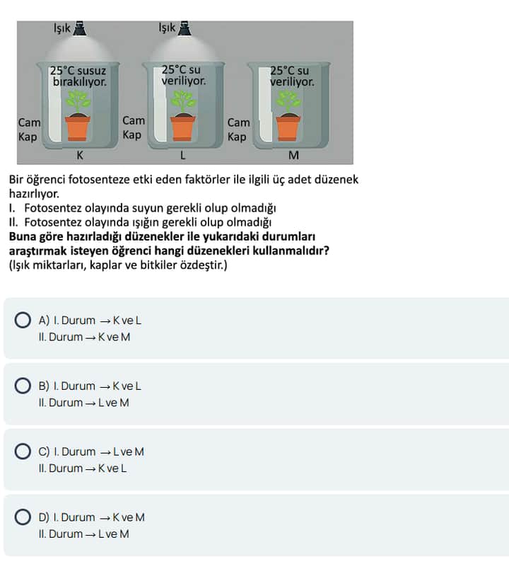 - “I. Durum: Fotosentez olayında suyun gerekli olup olmadığı” → K ve L düzenekleri,