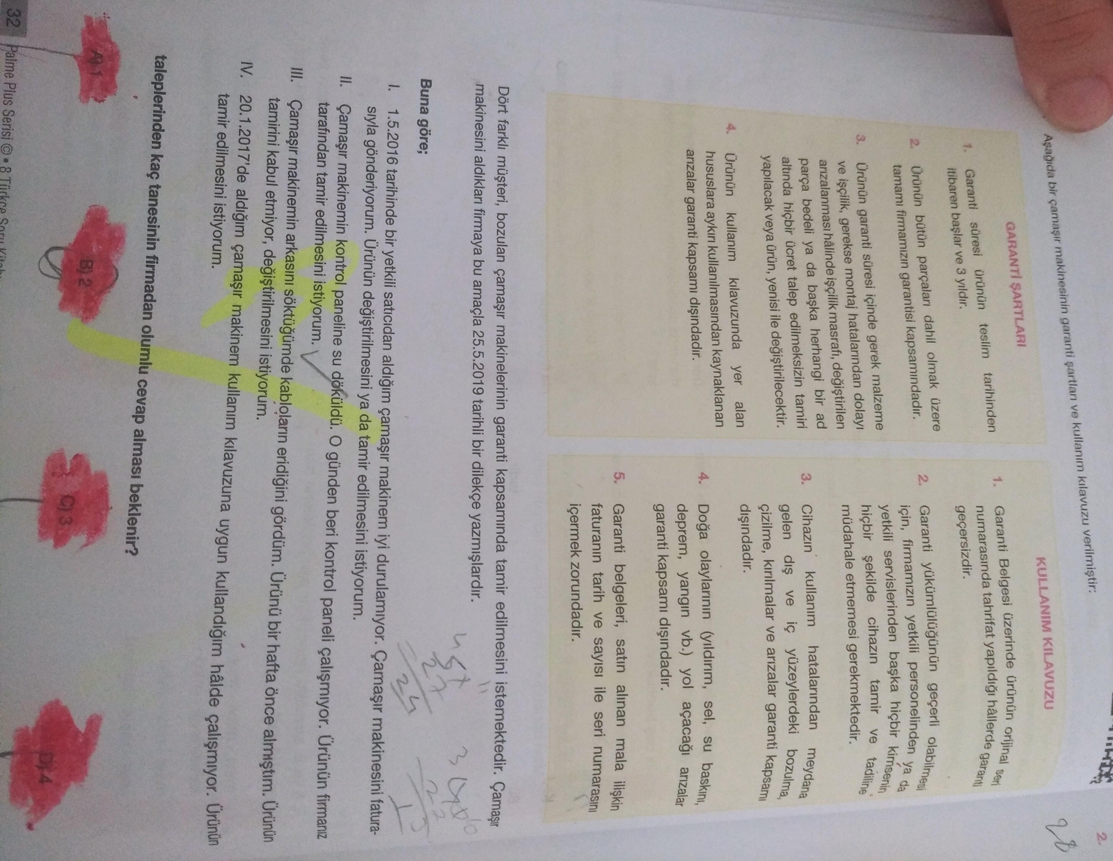 Soru: 21.10.2017 tarihinde alınan çamaşır makinesi, kullanım kılavuzuna uygun kullanıldığı hâlde çalışmıyor. Ürünün tamir edilmesi için 25.6.2019 tarihinde firmadan olumlu cevap alması beklenir mi?