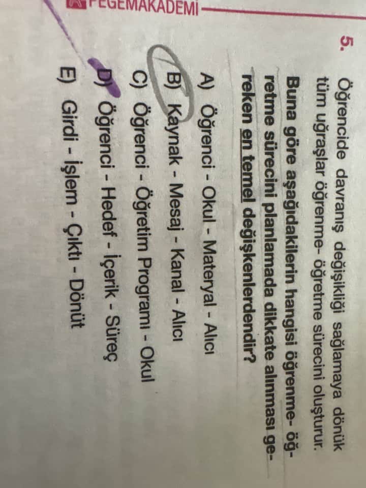 - Soruda verilen seçeneklerden “B) Kaynak - Mesaj - Kanal - Alıcı” ifadesi iletişim süreci kavramına aittir, öğrenme-öğretme sürecinin temel değişkeni değildir.