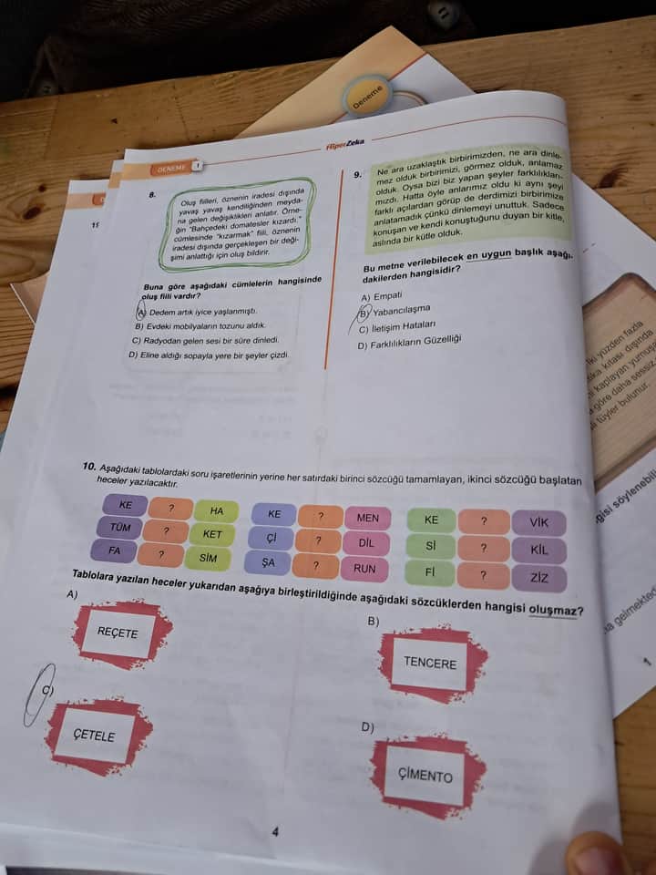 10. Aşağıdaki tablolardaki soru işaretlerinin yerine her satırdaki birinci sözcüğü tamamlayan, ikinci sözcüğü başlatan heceler yazılacaktır. Tablolara yazılan heceler yukarıdan aşağıya birleştirildiğinde aşağıdaki sözcüklerden hangisi oluşmaz?