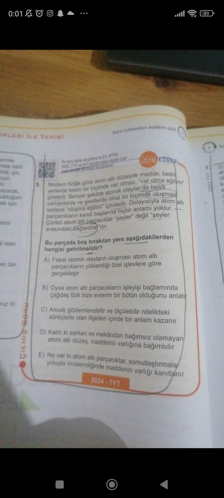 | D | “Kaldi ki zaman ve mekândan bağımsız olamayan atom altı düzey, maddenin varlığına bağımlıdır” | Zaman ve mekana bağlılık konusu, cümlenin anlamını tamamlamıyor |