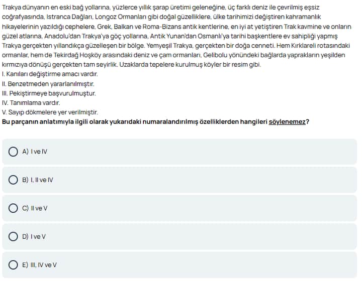 - Soru: “Bu parçanın anlatımıyla ilgili olarak numaralandırılmış özelliklerden hangileri söylenemez?”