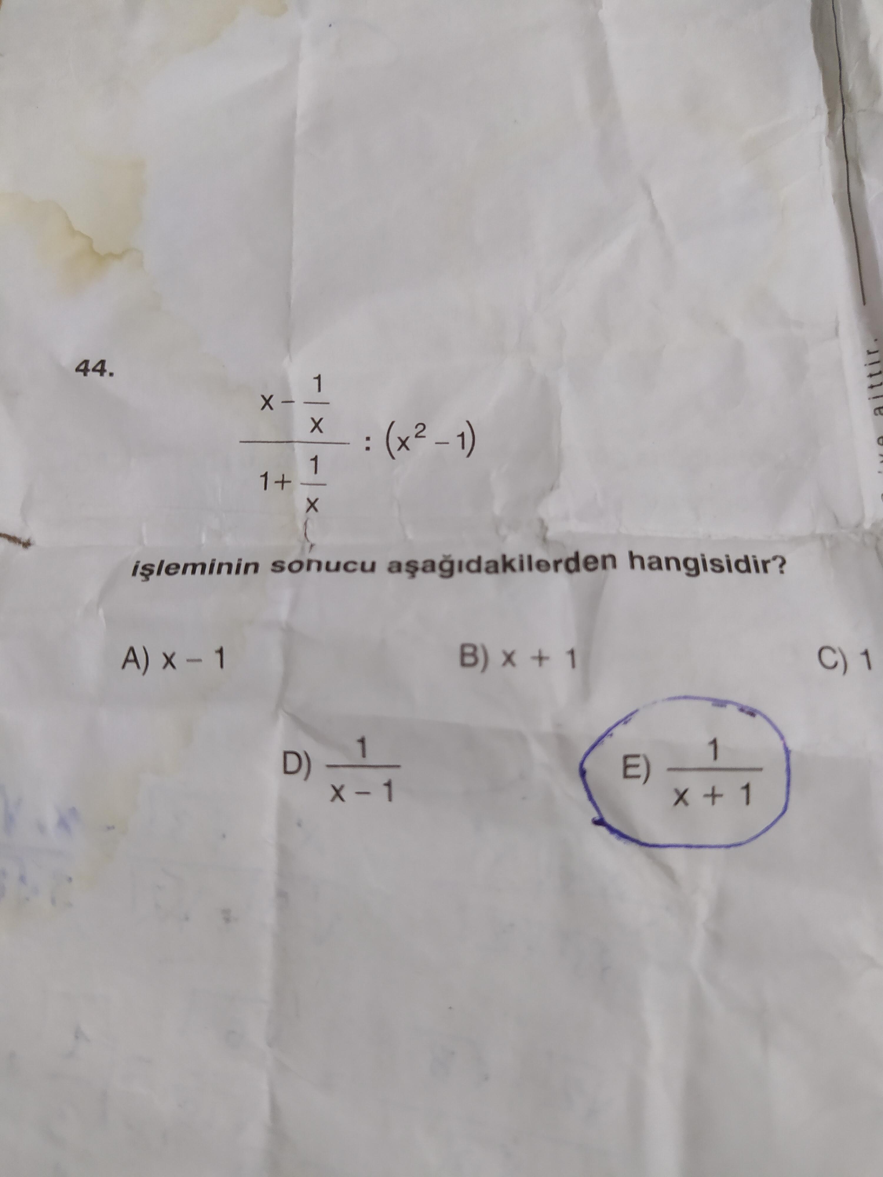 Aşağıdaki çözüm, görseldeki (44.) sorunun sonucunun neden 1/(x+1) çıktığını kısaca gösterir. Sorudaki ifade doğrudan resimden tam okunamasa da, genellikle böyle sorularda paydada yer alan (x² – 1) ifadesi (x – 1)(x + 1) şeklinde çarpanlara ayrılır. Ardından üst kısımdaki (payın) uygun sadeleştirmelerle (x – 1) gibi bir terimi yok ettiği görülür ve sonuç 1/(x + 1) şeklinde sadeleşir.