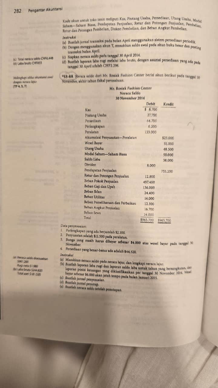 (b) Buatlah laporan laba rugi dan laporan saldo laba untuk tahun yang bersangkutan laporan posisi keuangan yang diklasifikasikan per tanggal 30 November 2014. Wesel bayar schesar $6.000 akan jatuh tempo pada bulan Januari 2015.